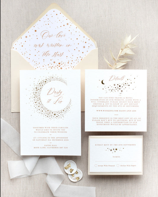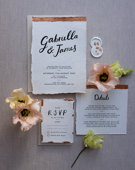 Your invitations are a taster of your big day, get your guests excited to RSVP yes! Choose from one of our beautiful house collections, ready to personalise with your wording and colour choices. All hand crafted with care in our studio.